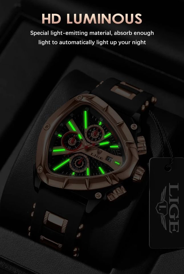 LIGE 89103 New Blue Sports Triangle Mens Watches Luminous Pointers Fashion Rubber Strap Quartz Wristwatch Waterproof Watch